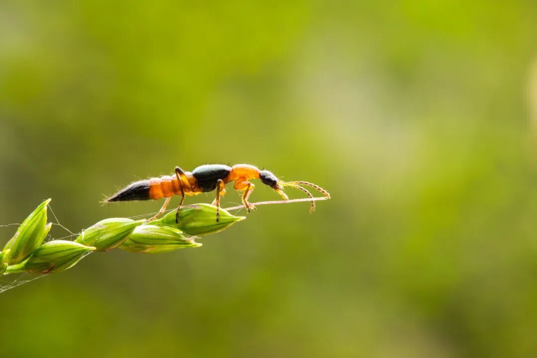 梭毒隐翅虫在外观上很好分辨,细细长长,红黑相间,头尾都是黑色。这种醒目的配色本身就是一种警戒色,向其他生物预警“我有毒,别惹我”。