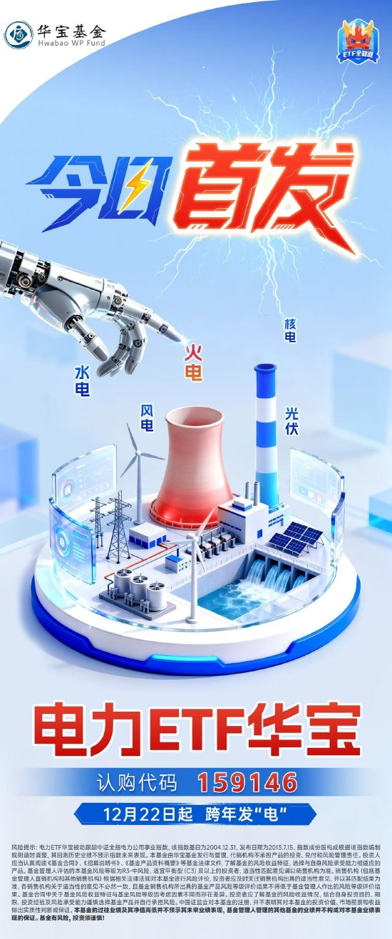 自12月22日(周一)起,千亿ETF大厂*华宝基金开始发行重磅新品“电力ETF华宝(159146)”,指向十分明确——把握AI相关能源机遇,为AI发“电”!该ETF将跟踪中证全指电力公用事业指数(H30199.CSI),通过成份股“火、水、风、核、光”的多态电力配置,助力投资者在AI大时代战略性地实现“全电布局,攻守兼备”。